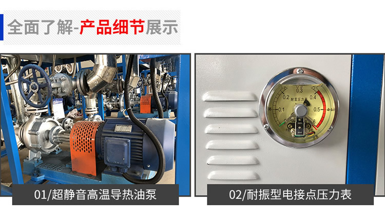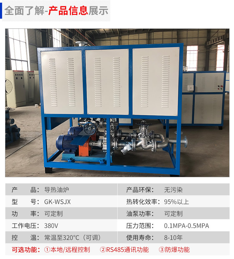 電加熱導熱油爐運行可靠:具有完備的運行控制和安全檢測裝置,可以精密地控制工作,防爆等級可達C級,因而其更加安全。