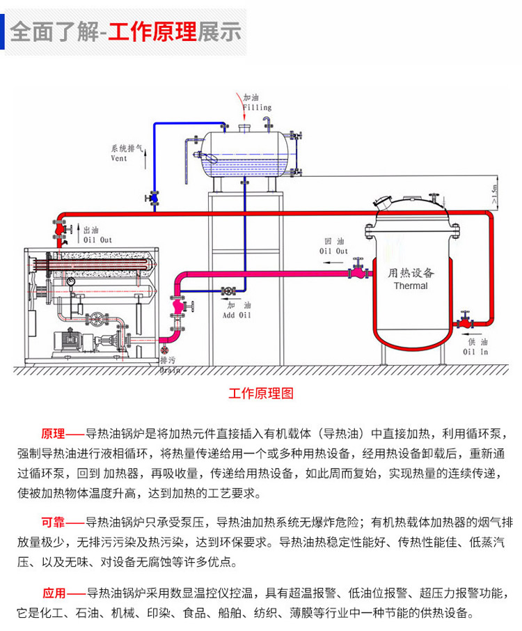 為熱用戶輸出高320℃的熱油;電加熱導熱油爐設備投資少:由于導熱油加熱系統簡單,無水處理設備及更多的輔助設備、鍋爐承受低壓力等,所以整個系統投資較少.