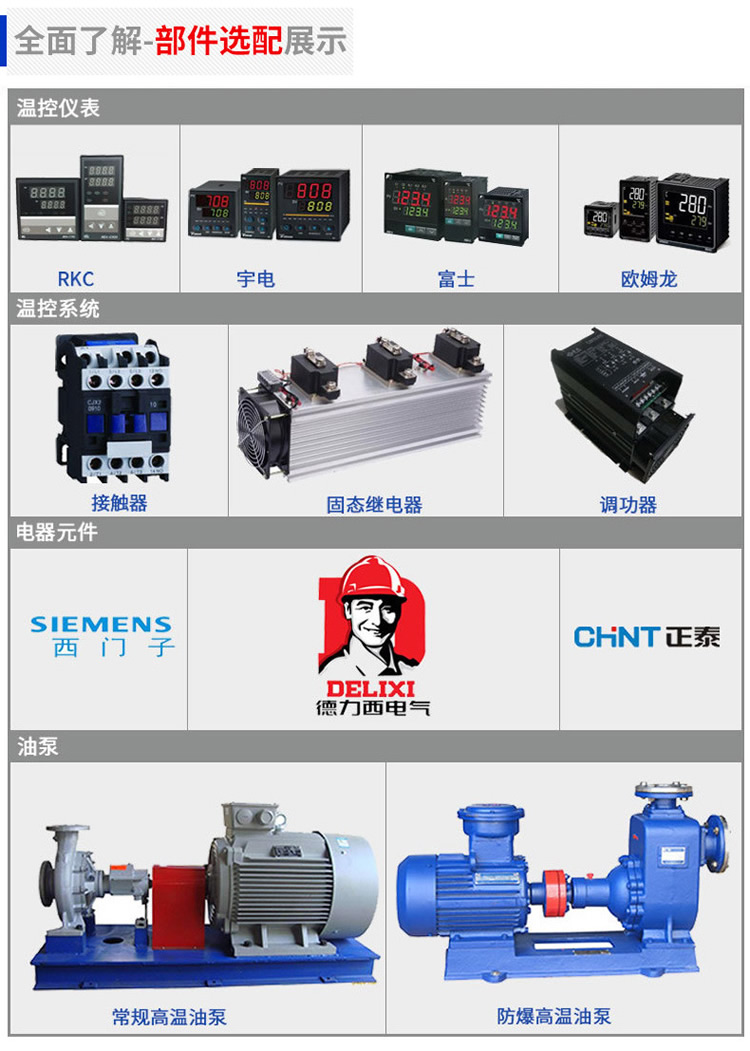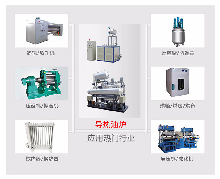 食品、化學工業:聚合、縮合、蒸餾、熔融、脫水、強制保溫等;油脂工業:脂肪酸蒸餾、油脂分解、濃縮、酯化、真空臭等反應釜加熱、合成纖維工業:聚合、熔融、紡絲、延伸、干燥等;紡織印染工作:熱定型輥筒加熱、烘房加熱、熱容染色等;非紡織工業:無紡布等;飼料工業:烘干等;塑料及橡膠工業:熱壓、壓延、擠壓、硫化成型等。造紙工業:干燥、波紋紙加工等。木材工業:多合板、纖維板加壓成型、層壓板加熱、熱壓板加熱、油壓機控溫、木材干燥等。建材工業:石膏板烘干、瀝青加熱、混凝土構件保養等;機械工業:噴漆、印花烘干等;