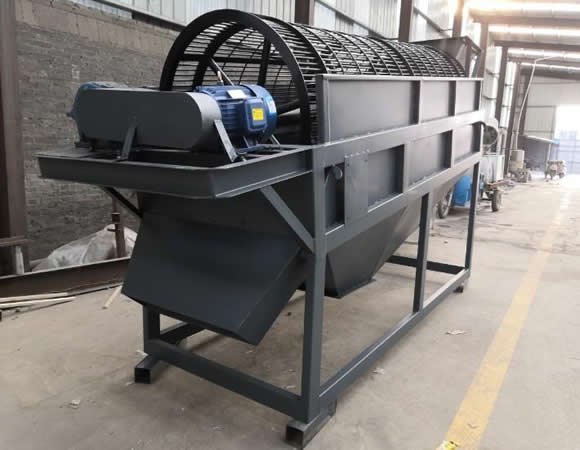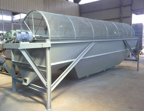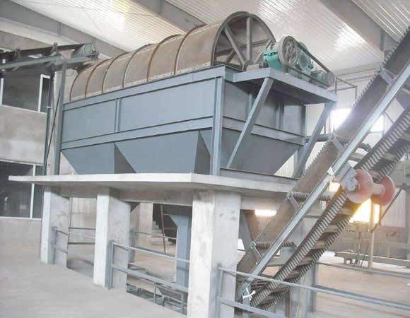 分級除雜滾筒篩: 滾筒篩整個設備有儲料倉、滾筒篩分機和皮帶輸送機組成。物料由裝載機裝入儲料倉,然后進入滾筒篩,旋轉的篩筒帶動物料在篩筒內翻滾,從一端向另一端移動,小于設定(網眼)的物料由篩網漏出進入皮帶機,然后由皮帶輸送機匯集從另一端卸出,大于網眼的廢料部分從篩網另一端排出,整個過程連續,物料分級準確,滾筒篩由電機、減速機、驅動聯軸器、軸承支座和篩籠等組成。