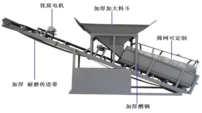 設計合理,結構緊湊,移動維護方便,更換篩底僅需10分鐘。裝載機一次裝料,不需要輸送,直接篩分。