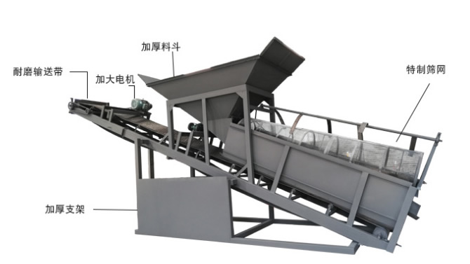 3、篩分效率高:設備設有梳型清篩機構,在篩分過程中,不管進入篩分筒的物料多臟、多雜都可以篩分從而提高了設備的篩分效率;